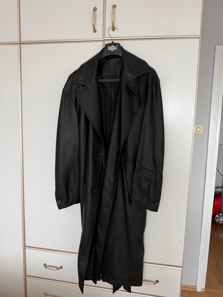 Erkek siyah deri trençkot, keskin yaka, uzun kollu ve kemerli bel detayına sahiptir. Minimalist gotik tarzda, ofis kullanımı için uygundur.