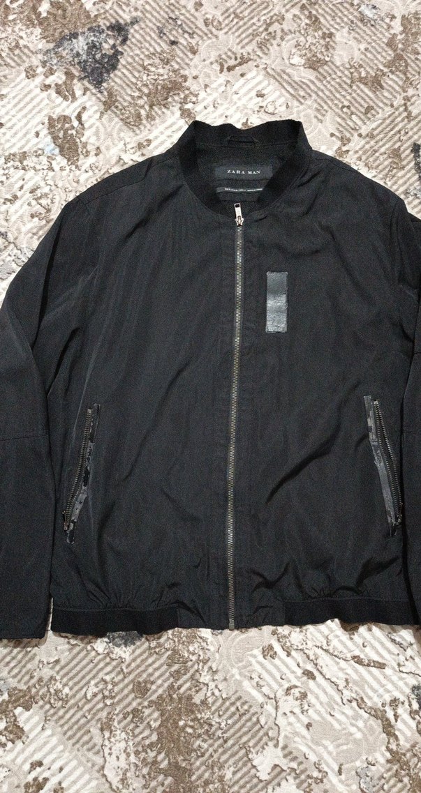 Zara erkek mont, fermuarlı ön ve ceplere sahip. Yuvarlak yaka, uzun kollu, bol kesim ve sentetik kumaştan, siyah renkte, günlük sokak stili için uygun.