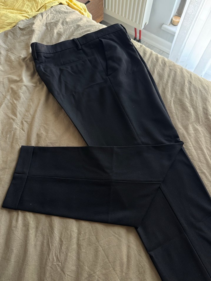Erkek siyah kumaş pantolon, normal kesim ve midi boydadır. Kemerli ve sentetik dokulu, ofis ve günlük sokak tarzına uygundur. Kumaşı %68 polyester, %28 viskoz, %4 elastandır.