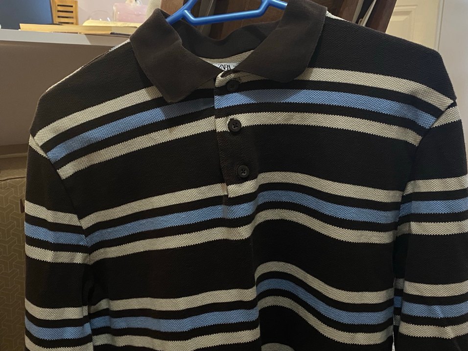 Kahverengi ve mavi çizgili, düğmeli yakalı erkek polo kazak. Uzun kollu, bol kesim.