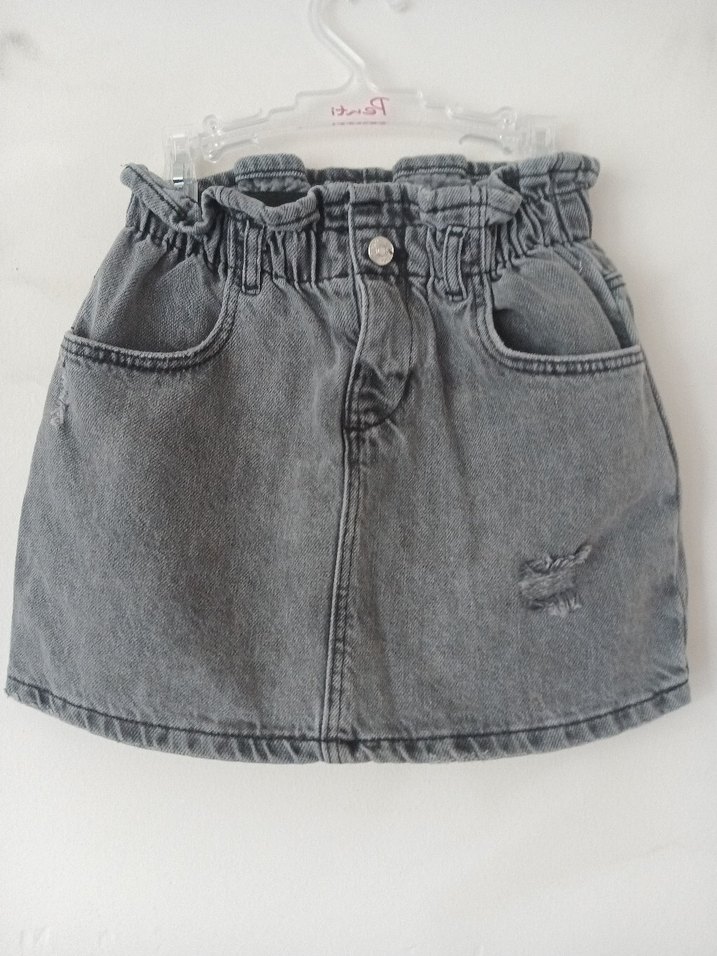 Gri denim kumaştan, kemerli ve bol kesimli kız etek. Sokak modasına uygun, desen içermeyen ve hafif yıpranmış detaylara sahip.