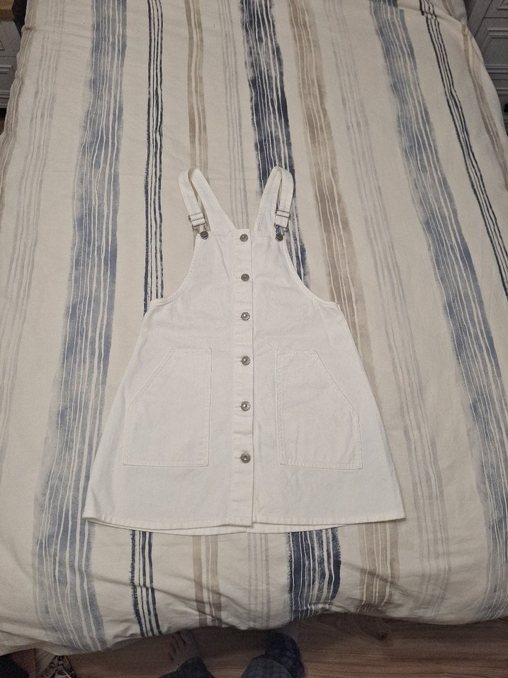 Pamuklu, düğmeli, geniş kesim beyaz kısa tulum. 11-12 yaş için uygundur ve 152 cmdir. Son 2 görselde minik lekeler vardır.