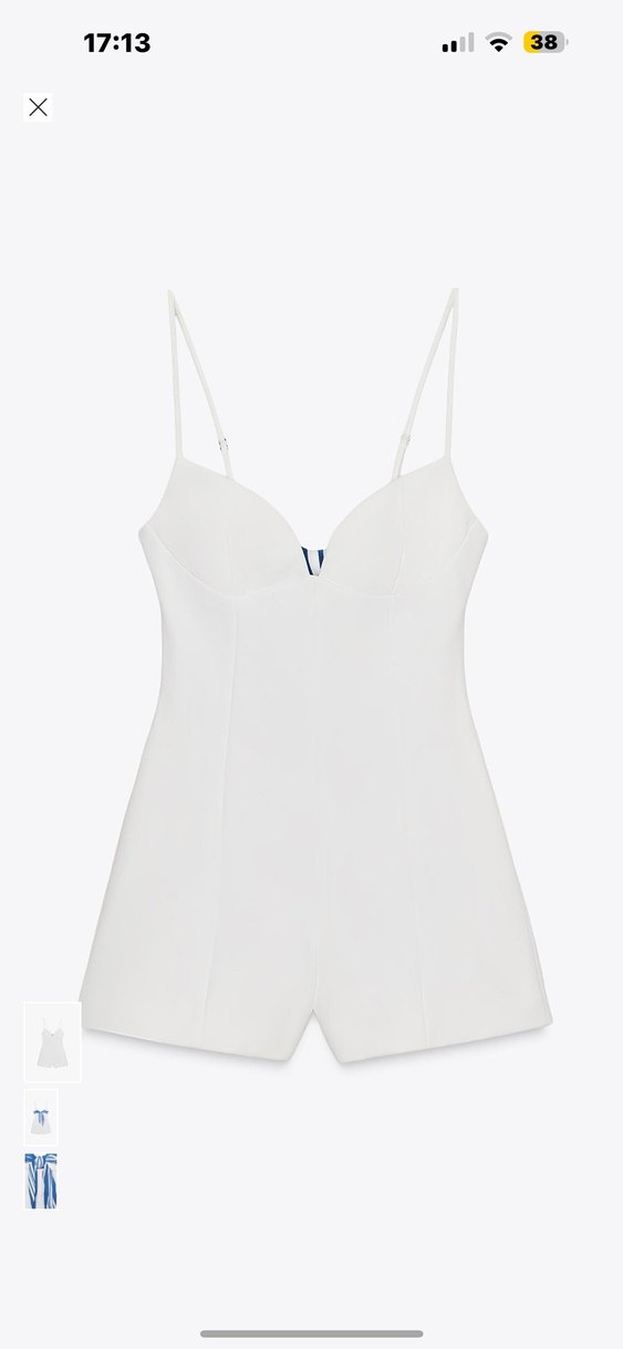Beyaz renkte, V yakalı ve kolsuz kısa tulum. Sade ve şık görünüm sunan, vücuda oturan tasarım, rahat sentetik kumaştan yapılmıştır. ✨Zara etiketli sırt bağlamalı