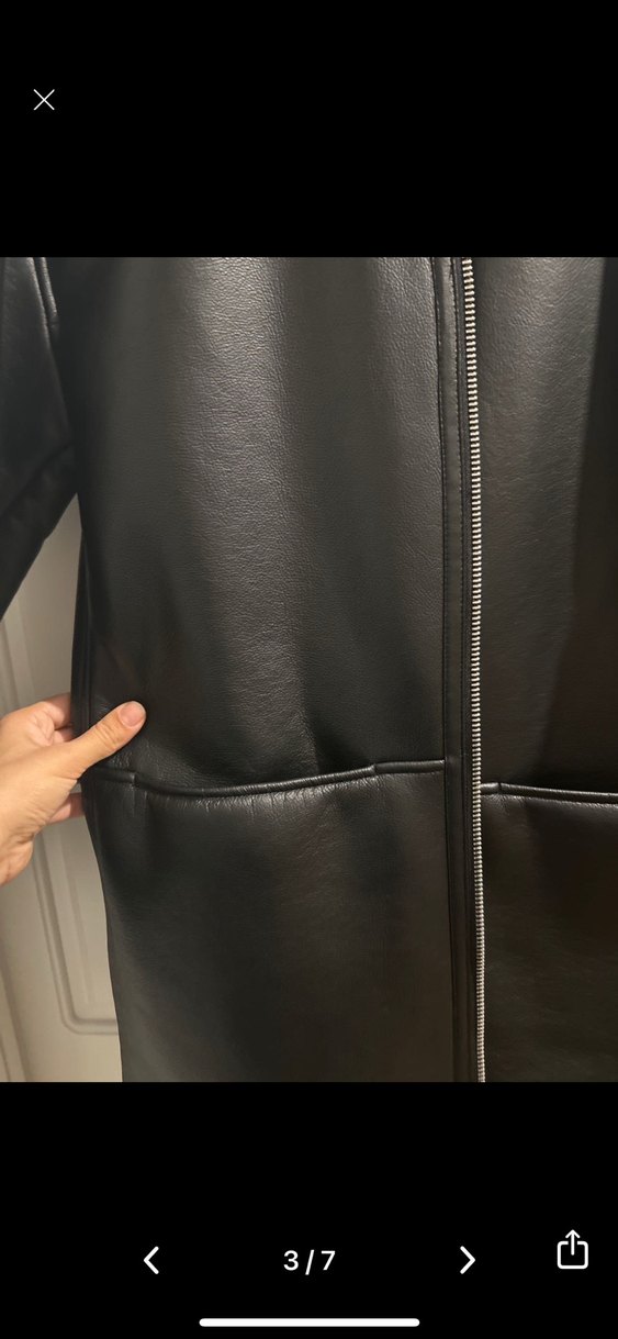 Fermuarlı, siyah deri ceket, notlu yakaya sahip. Uzun kollu, midi boy ve vücuda oturan kesim. Minimalist, günlük kullanıma uygun.