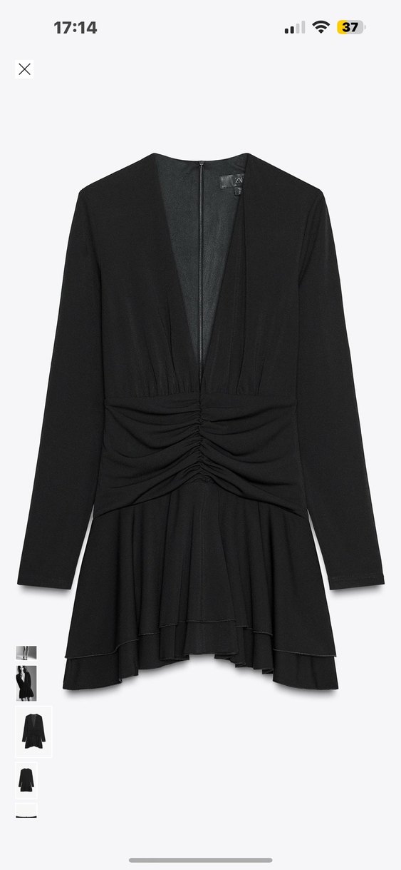 Siyah ve drapeli, V yaka uzun kollu, vücuda oturan bu elbise, sentetik kumaştan yapılmıştır. Gotik Paris tarzıyla romantik akşamlar için uygundur. Zara etiketli tulum elbise