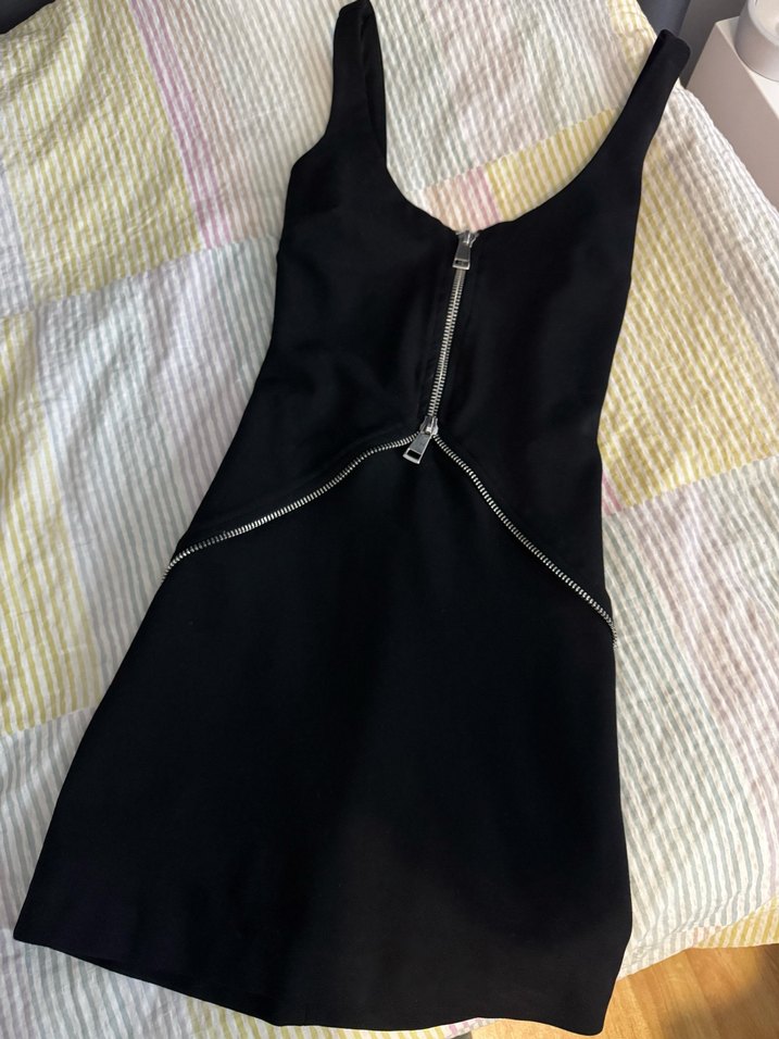 Bu siyah mini elbise, V yakalı ve kolsuz tasarıma sahip, vücudu saran kesimdedir. Fermuar kısmı açılıyor istediğiniz gibi ayarlayabilirsiniz. Bir kez giydim sadece, defosu yok. Xs beden fakat S bedene de uygun.