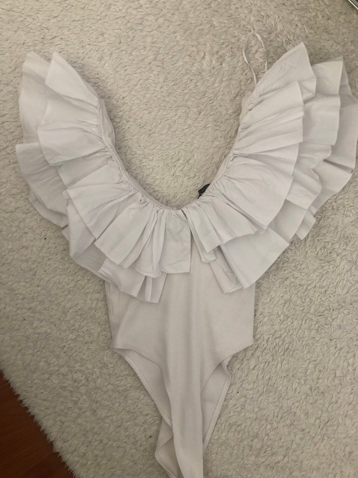 V yaka, fırfırlı detaylı body. Askılı kollu ve desensiz, düz tasarıma sahiptir.