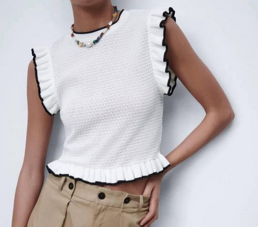 Beyaz triko bluz, yuvarlak yaka ve fırfır detaylara sahiptir. Kısa ve salaş kesim olup, nakışlı ve kolsuzdur. Rahat sokak stili için uygundur.