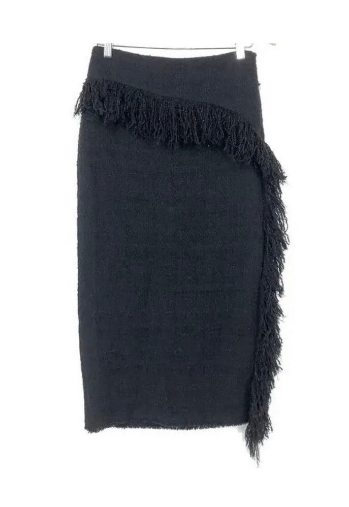 Tüvit kumaştan yapılmış, bohem tarzda, fırfırlı ve siyah midi, vücuda oturan etek. Avant-garde ve ofis kullanımı için uygundur. Hiç kullanılmamıştır.