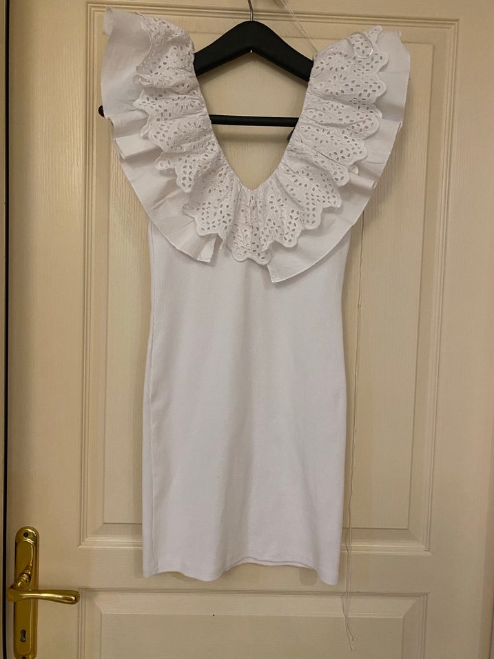 Pamuk kumaştan, nakışlı fırfırlı V yaka detaylı, kolsuz beyaz midi elbise, vücuda oturan kesime sahiptir.