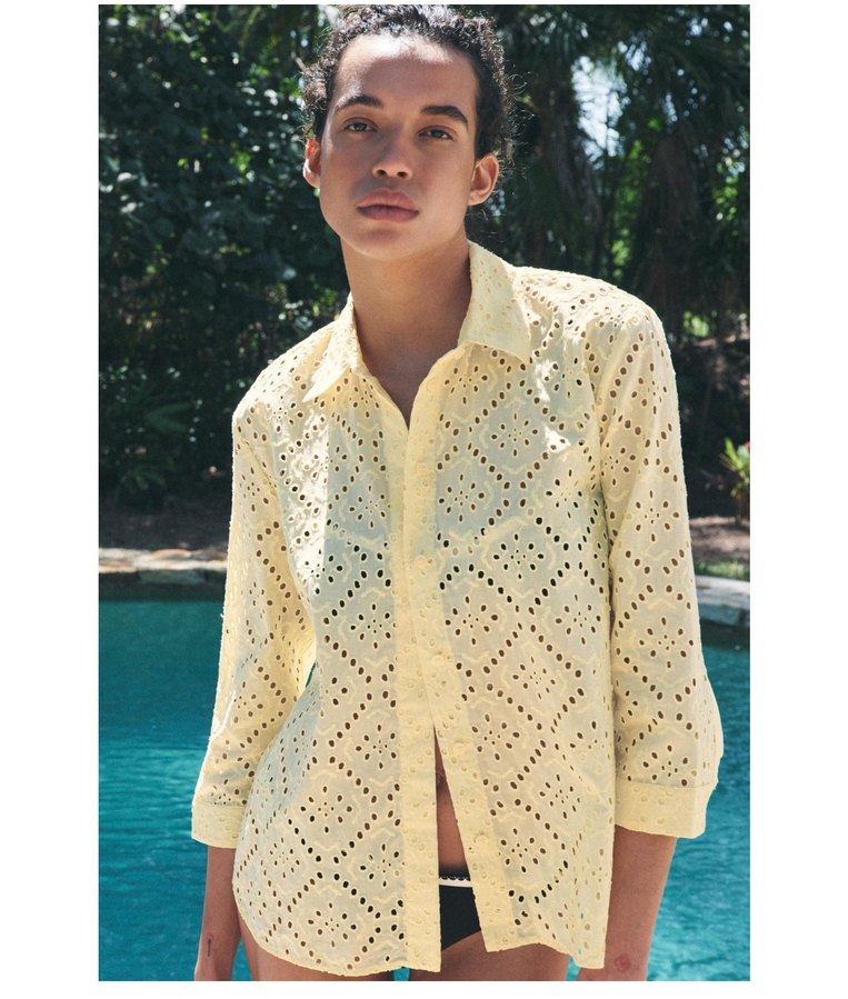 Sarı pamuklu, dantel işlemeli, yakalı ve bol kesim uzun kollu gömlek. Normal boyda, açık hava kullanımı için uygun. Hiç kullanılmamıştır. Hiçbir deformasyonu yoktur. Orijinal Zara mağazası ürünüdür. Görsellerde ölçüleri eklidir. Videosu eklidir. Sezonun trend renginden tereyağı sarısı rengidir.