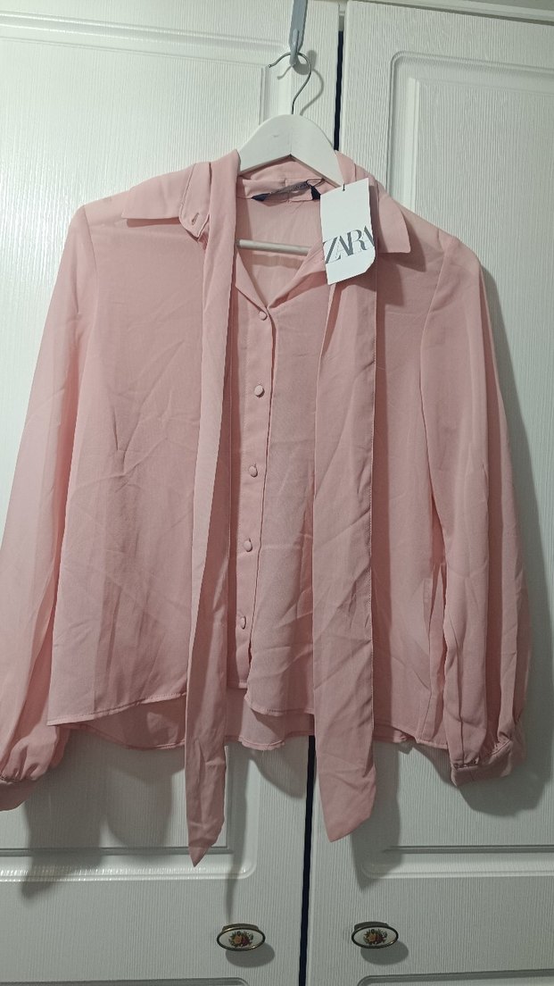 Zara fularli Pembe Uzun Kollu Kadın şifon Gömlek