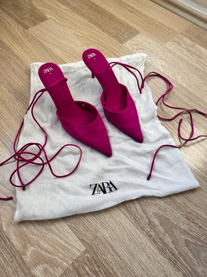 Zara fuşya stiletto kadın ayakkabılar, sentetik kumaştan yapılmış, elastik bağcıkları ve sivri burun tasarımıyla romantik akşamlar için uygundur. Ayakkabıda bi kusur yok, dolapta durmaktan ipleri açılmış.