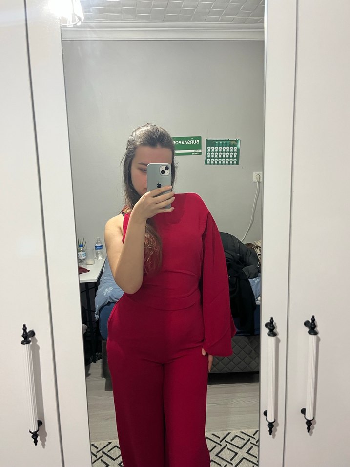 Kadınlar için tek omuzlu, uzun kollu, kırmızı parlak ve ipeksi kumaştan midi boy tulum. Rahat ve şık görünüm sağlar.