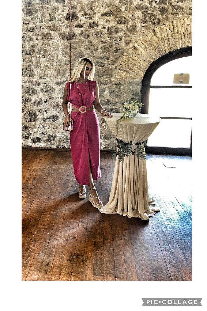 Pembe renkli, uzun elbise, bol kesim ve keten dokuda. Bisiklet yakası ve ince askılarıyla bohem tarzda tercih edilir.