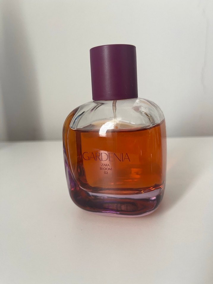 Zara Gardenia Bloom kadın parfümü, mor kapaklı ve şeffaf cam şişede amber renk sıvı ile çiçeksi koku sunar.