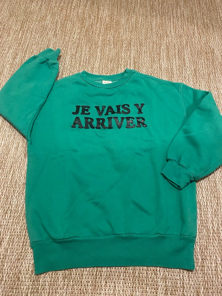 Örme dokulu, uzun kollu ve yuvarlak yakalı, rahat kesim yeşil sweatshirt. Önünde 'JE VAIS Y ARRIVER' yazılı baskı bulunur. Günlük kullanıma uygun.