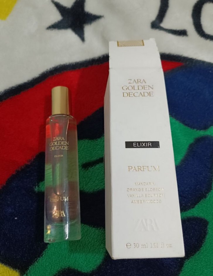 Zara Golden Decade Elixir kadın parfümü, 30 ml şişede sunulur. Portakal çiçeği, vanilya buketi ve amber odunları notaları içerir.