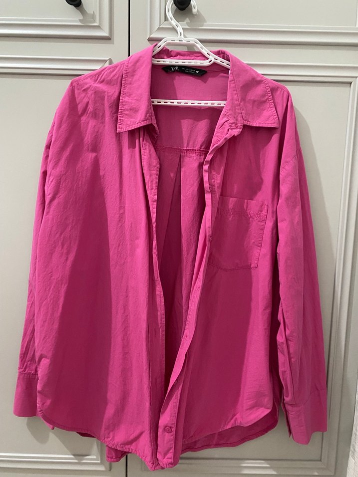 Pembe, düğmeli uzun kollu gömlek. Salaş kesim, yakalı ve parlak kumaştan, günlük kullanıma uygun minimalist ve sade tarzda. Ölçüm olmadığı için ölçemiyorum. 162 boyundayım, benim kalçamı kapatıyor giydiğimde.