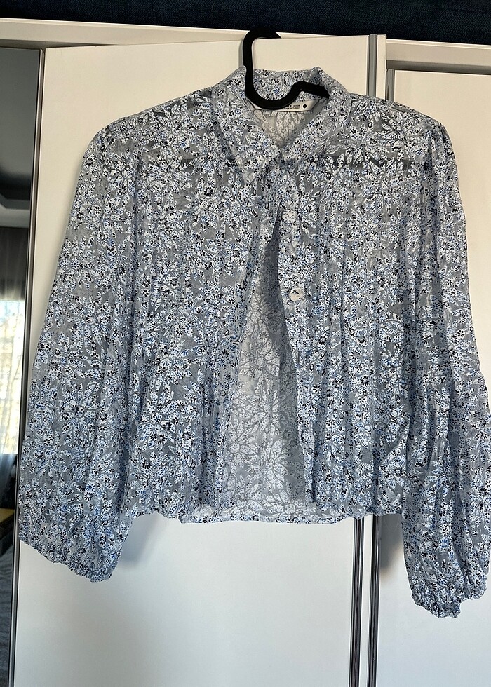 Transparan zara marka S beden gömlek. Staj için almıştım 2 kez giydim. İçine beyaz/siyah atletle iş yerinde, bikiniyle yazın üste çok iyi durur. Kolları lastikli uzun kol ama ara bi boyu var. Açık mavi üzerinde çiçek desenli gömlek.