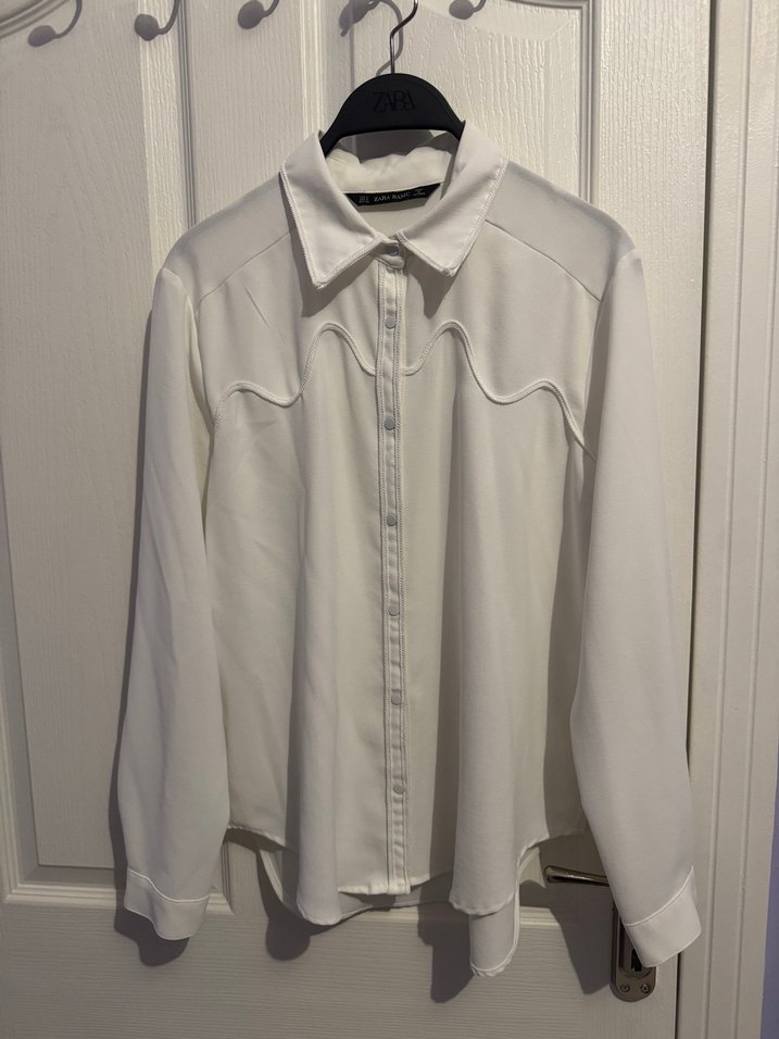 Zara marka, uzun kollu, yakalı ve çıtçıt düğmeli beyaz kadın gömleği. Normal boyda, regular her kombinle uyumlu, günlük ve ofis için uygundur.