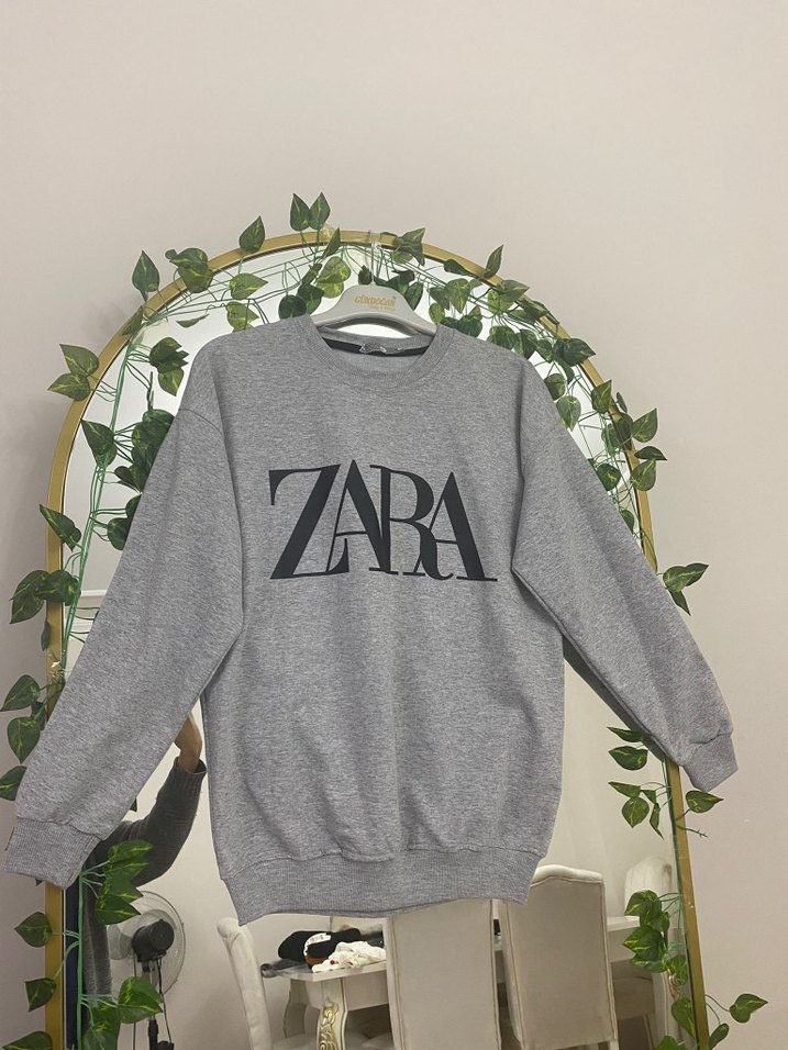 Zara gri baskılı sweatshirt, uzun kollu, yuvarlak yaka ve bol kesim. Yumuşak ve sıcak kumaştan günlük rahat kullanım için uygun.