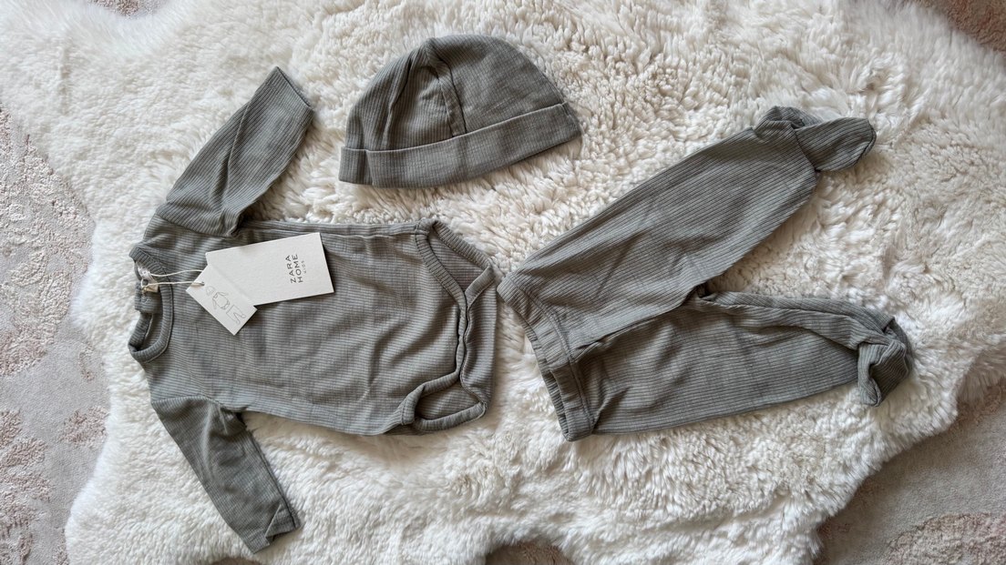 Gri renkli, üst, pantolon ve şapka içeren bebek takımı. Yumuşak kumaştan yapılmış, rahat ve şık