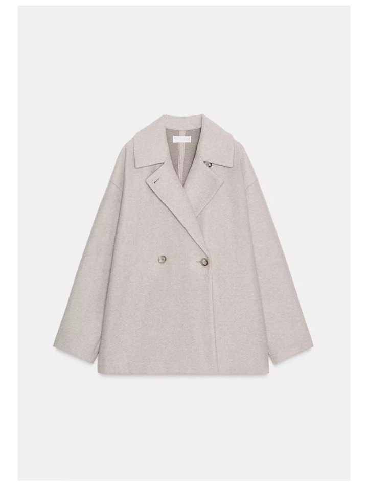 L beden Yumuşak gri kumaştan yapılmış, geniş yakalı çift düğmeli kısa kaban. Rahat kesim ve uzun kolludur.
