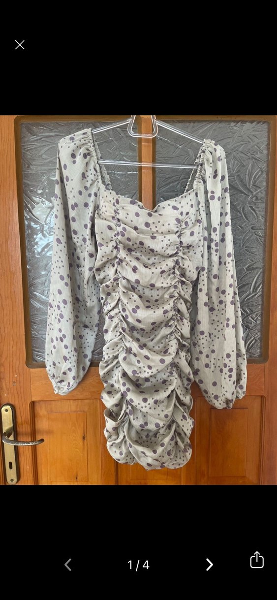 Gri puantiye desenli, uzun kollu ve drapeli kesime sahip, bohem tarzda mini elbise.