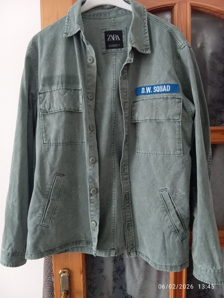Zara marka, düğmeli, uzun kollu, gri denim ceket , normal midi boyda, cepli ve D.W. Squad detaylı, günlük rahat stil için uygun.