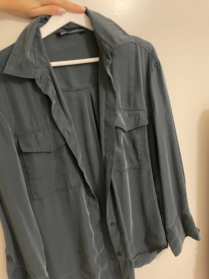 Gri keten kumaştan, düğmeli ve notched lapel yakalı, uzun kollu, midi boyda bol kesim kadın gömlek. Rahat ve minimalist tarz için uygun.