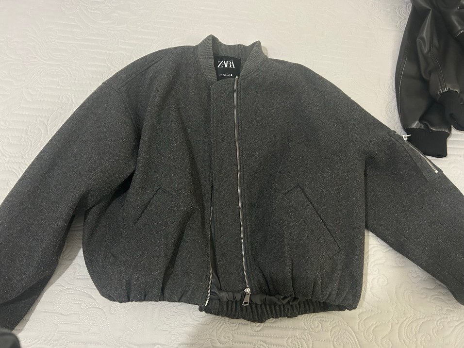 Zara marka, uzun kollu, gri renkli, yumuşak ve sıcak dokulu kumaştan yapılmış, fermuarlı, normal midi uzunlukta, salaş kesim kadın bomber cekettir.