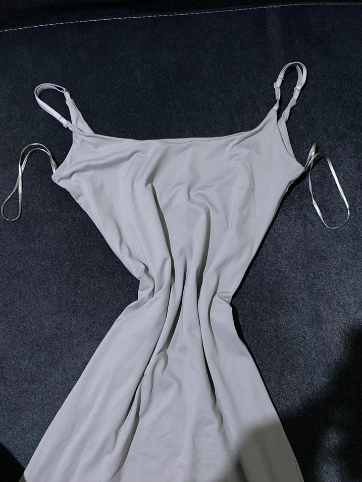 Çok iyi durumda, 2 kez giyildi, Gri renkte, uzun ve vücuda oturan uzun elbise, ip askılı ve straplez yakaya sahiptir. Desensiz sade tasarım.