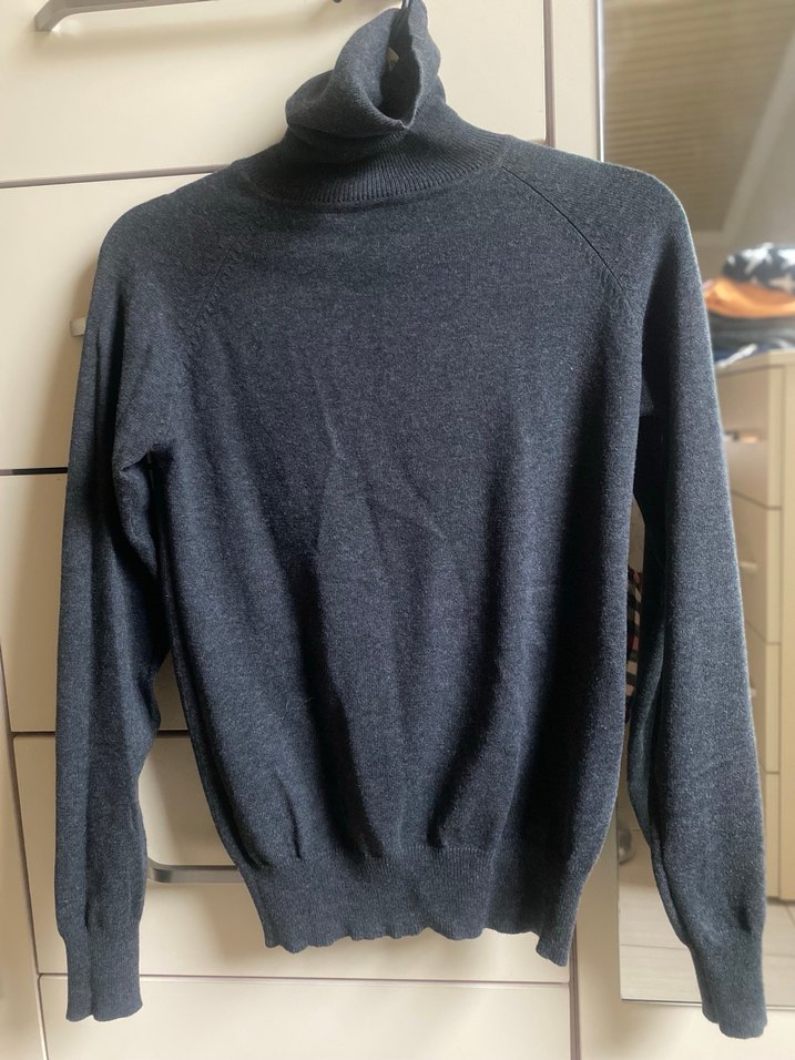 Gri renkli, yumuşak yün örme kumaştan, boğazlı ve uzun kollu, vücuda oturan kesime sahip rahat bir kadın kazak . Tertemiz iadesi yok.