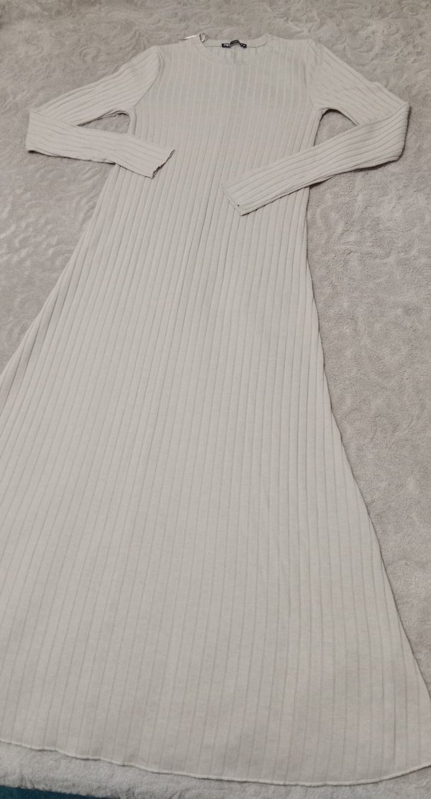 Gri renkte, uzun kollu ve bisiklet yaka pilili, vücuda oturan uzun elbise. Yumuşak sentetik kumaştan, günlük rahat kullanım için uygun.