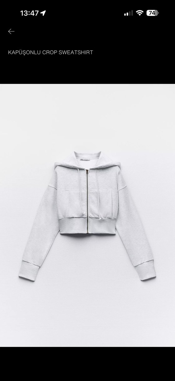 Gri renkli, kapüşonlu ve fermuarlı bu sweatshirt uzun kollu, kısa kesim ve bol kesimdir. Yumuşak ve sıcak kumaştan üretilmiştir, günlük rahat kullanıma uygundur.