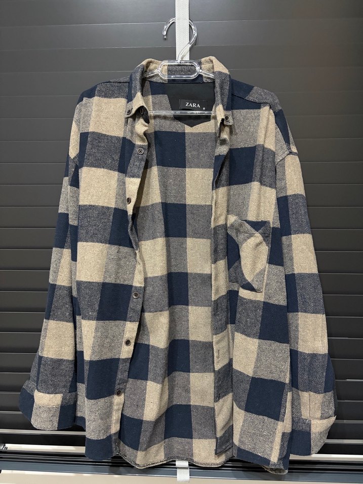 Zara marka, pamuk kumaştan, gri kareli, uzun kollu, düğmeli ve bol kesim gömlek.