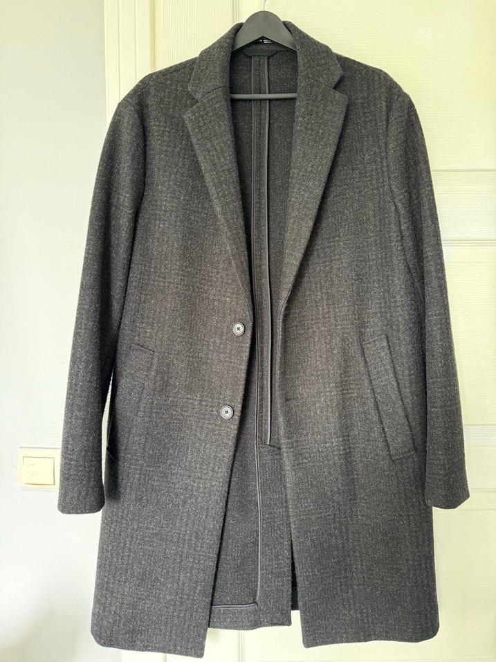 Gri yün kaban, kesik yakalı ve düğmeli ön detaylara sahiptir. Normal kesim, uzun kollu ve midi boydadır, ofis için uygundur. M Beden ve yeni üründür. Sadece 2 kez giyilmiştir. Defo yoktur detay çekim yapılmıştır.