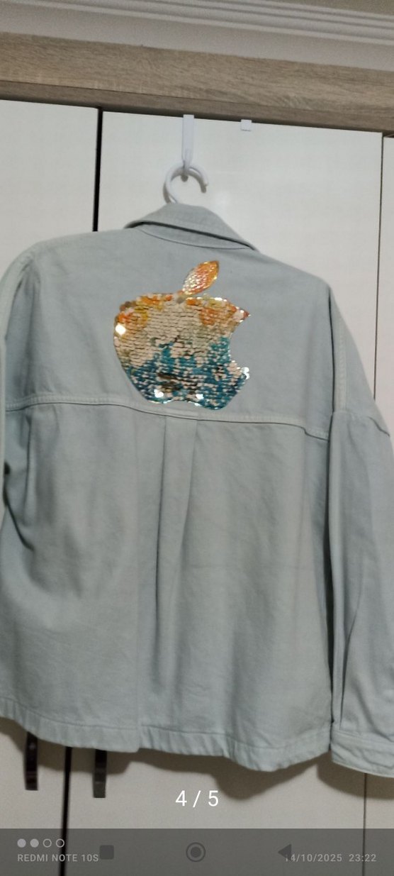 Zara markalı, pastel gri renkte, kısa kesim, uzun kollu, düğmeli ve baskılı detaylı bol kesim denim gömlek.