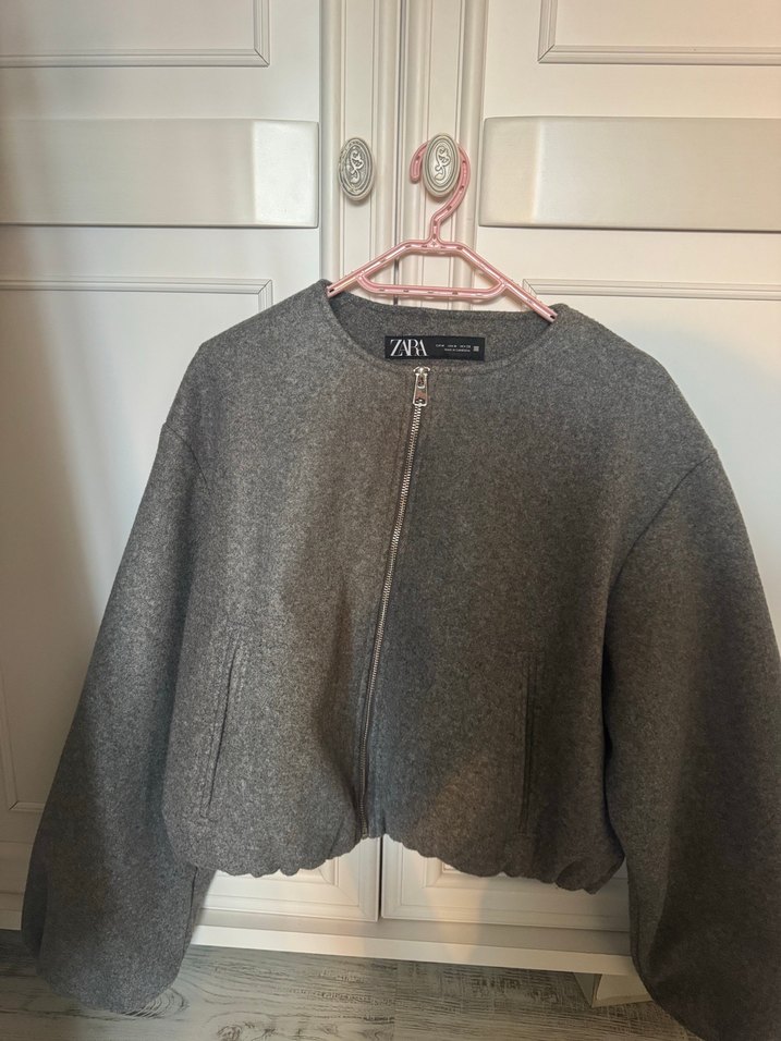 Gri renkli, kısa kesim kadın bomber ceket, yuvarlak yakalı ve uzun kolludur. Hiçbir kusuru yok en fazla üç kere giyildi sıra gelmediği için satıyorum.