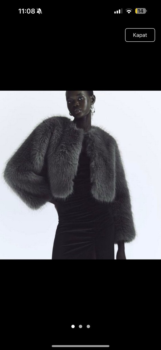 Kadınlar için gri renkli, kısa kesim, kürk detaylı ve sentetik kumaştan yapılmış, yüksek yakalı uzun kollu şık ceket. Avant-garde ve gotik tarzlara uygun.