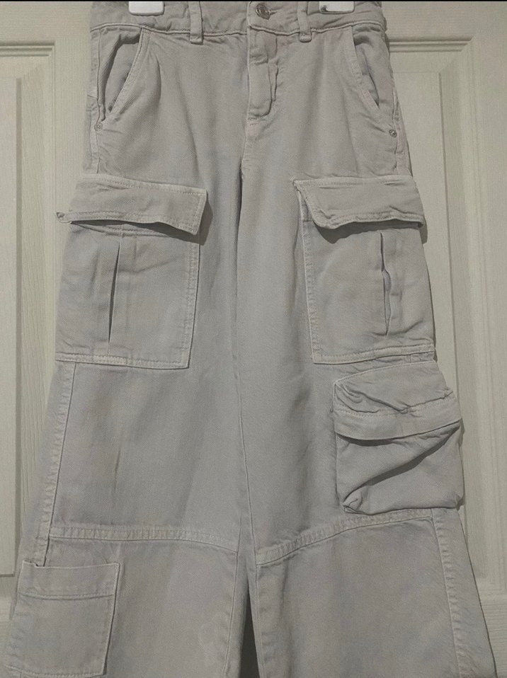 Gri midi uzunlukta kot pantolon, bol kesim ve çoklu ceplerle rahat bir sokak sitili tarzında.