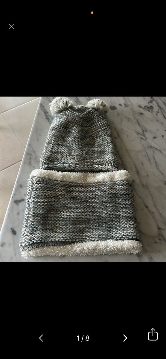 Gri -krem örgü çocuk bere, ponponlu ve yumuşak astarlı boyunluk ile birlikte set halinde sunulur.