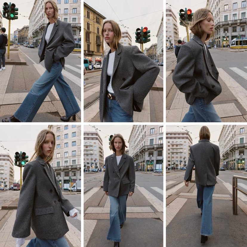 Gri renkli kruvaze kesim blazer, düğmeli ve uzun kolludur. Normal boyda, vatkalı oversize kesime sahiptir, günlük sokak stili için uygundur.