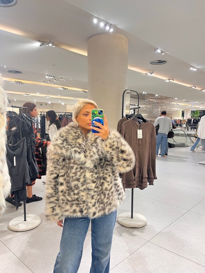 Gri leopar desenli suni kürk, notched lapel yakalı ve uzun kolludur. Rahat kesimi ve midi boyuyla gündelik sokak stiline uygundur. ZARA sold out yeni sezon sitede ve mağazalarda kalmamış ürün SİTESİNDE DE 5000+ TL DİR Hiç kullanmadım satmak amacıyla sonuncuyu aldım