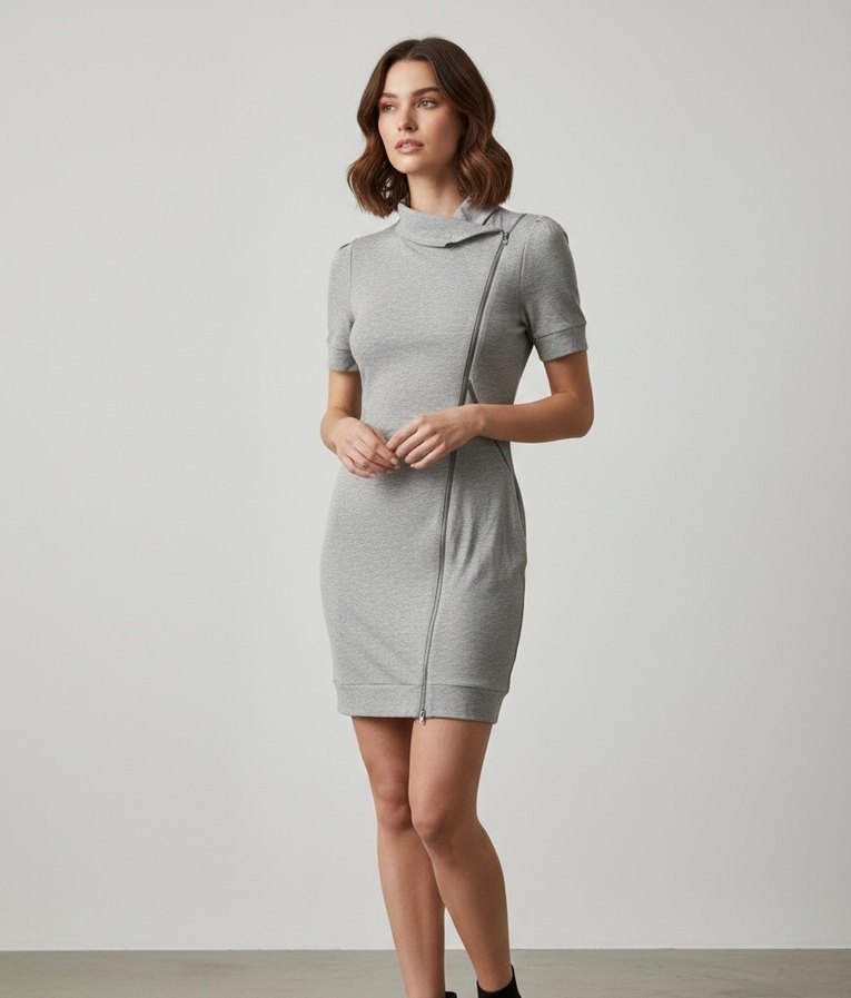 Yumuşak sentetik kumaştan yapılmış, yüksek yakalı ve kısa kollu gri mini elbise. Şık fermuar detayıyla çağdaş ofis stiline uygundur.