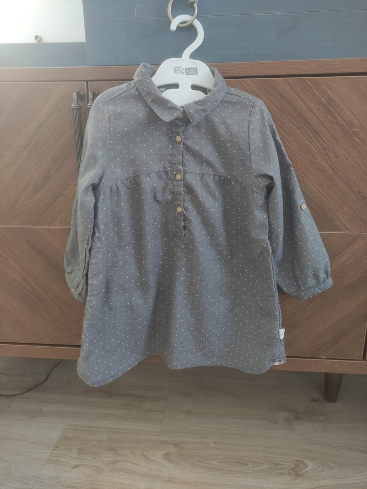Gri renkte, puantiyeli desenli, uzun kollu, düğmeli ve yakalı pamuk kız elbisesi, rahat kesimlidir. Pamuklanma ve küçük bir lekesi var. Fiyata yansıttım.