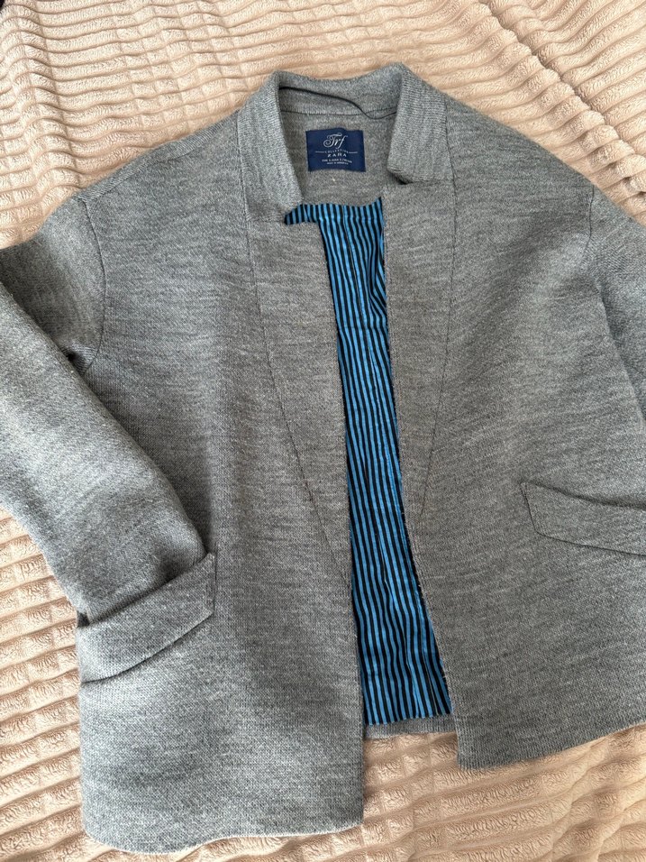 Gri triko ceket, notched yaka ve uzun kolludur. Midi boyda, rahat kesim ve çizgili astarla günlük kullanıma uygundur. Orjinaldir hiç bir sorunu yok sadece tüylenme var kumaşından o da çektim zaten fotoğraflarda var