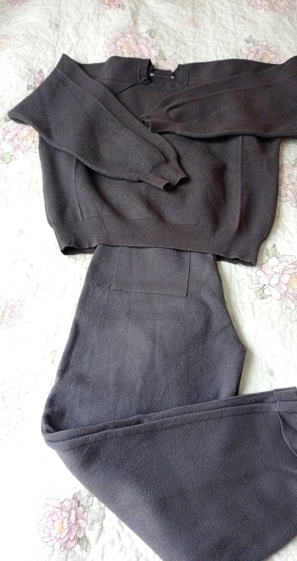 Kadınlar için gri triko eşofman takımı, bol kesim ve midi boyda. Yumuşak, sıcak dokuma kumaştan, bisiklet yaka ve uzun kollu, günlük kullanıma uygun.marka temsilidir