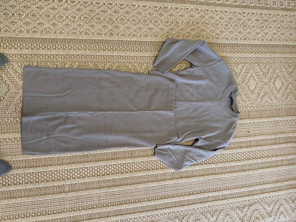 Gri renkte, uzun kollu kazak ve vücuda oturan etek takımı. Yumuşak örme sentetik kumaştan rahat günlük kullanım için uygundur.